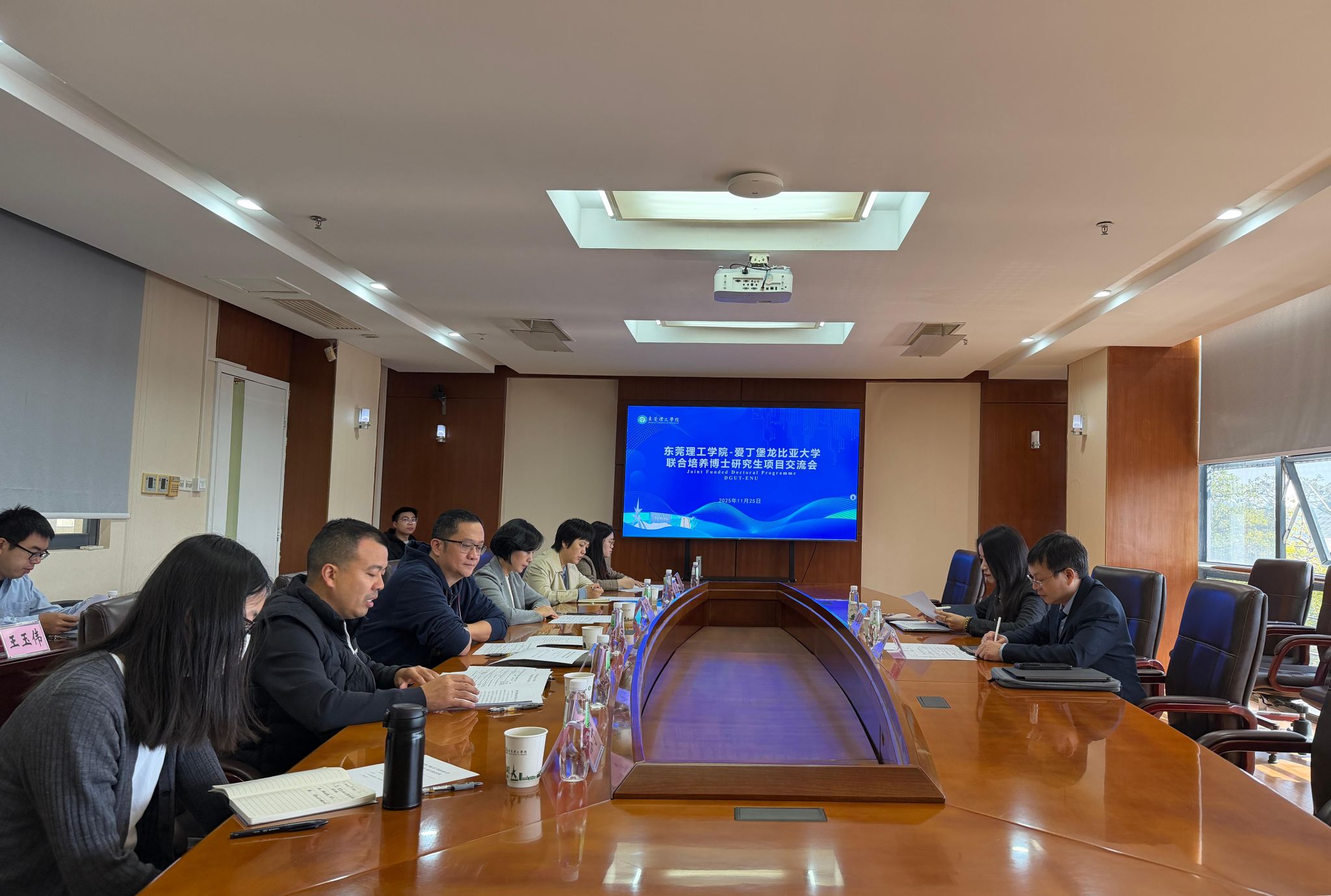 2025年11月25日上午,我校与英国爱丁堡龙比亚大学在学校松山湖校区举行联合培养博士研究生项目交流会。副校长郑愚、yl88858永利集团法国国立工艺学院联合学院党委书记、副院长尹玲,英国爱丁堡龙比亚大学计算机、工程与建筑环境学院副院长Johnson Zhang,中国办公室主任Carina Liao,以及学校部分导师代表、相关项目负责人出席会议,研究生院副院长沈飞主持本次交流会。