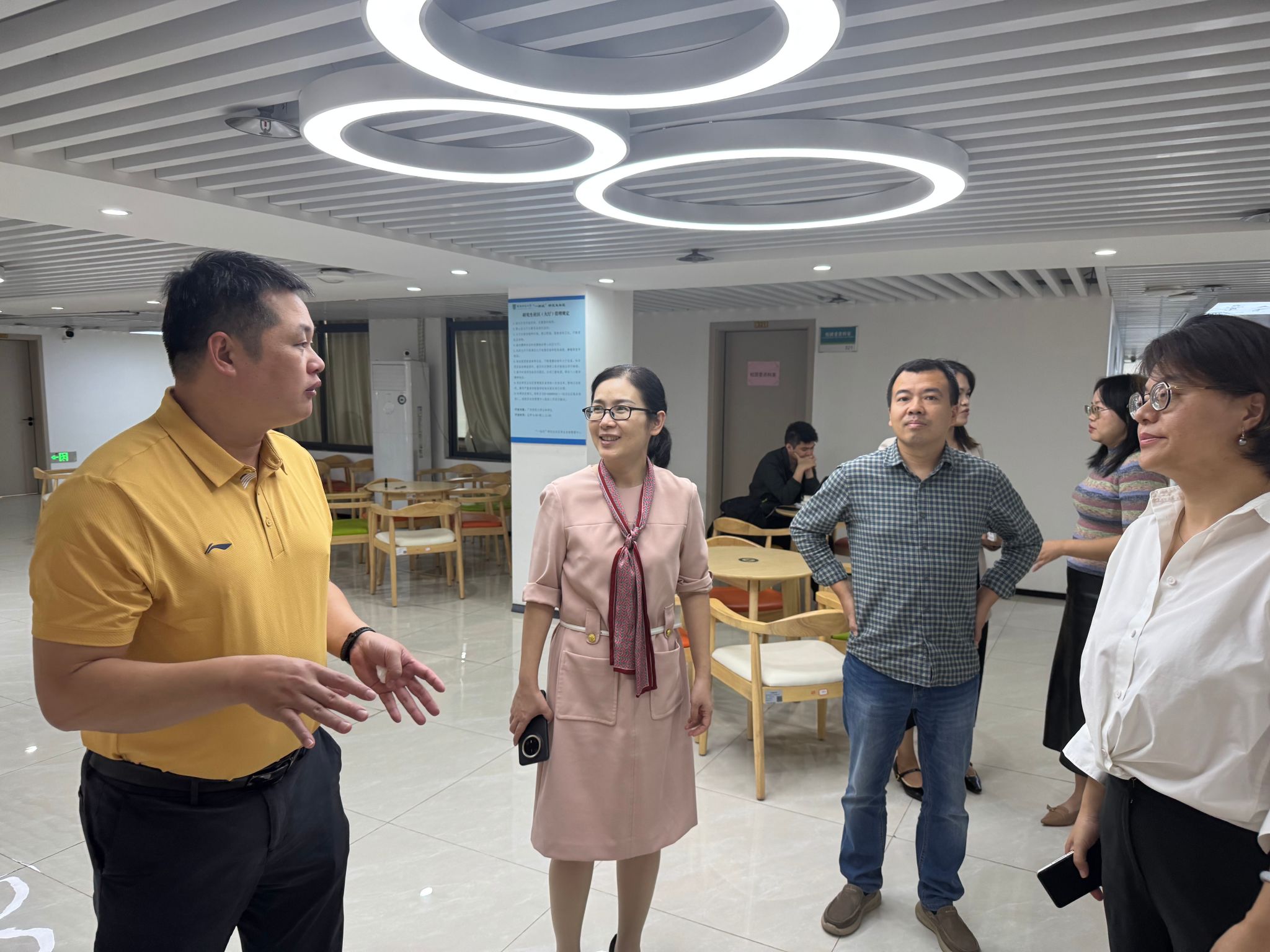 为进一步直观感受“一站式”研究生社区的建设实效,座谈会后,在广东财经大学研究生院领导的陪同下,我院一行实地参观了该校研究生社区三楼综合服务中心,逐一考察了社区内各类功能室的布局规划与运营模式,详细了解社区在服务学生日常需求、支撑学术交流、开展心理健康辅导等方面的具体做法,并在走访过程中就功能室管理、活动组织等细节问题持续交流探讨。