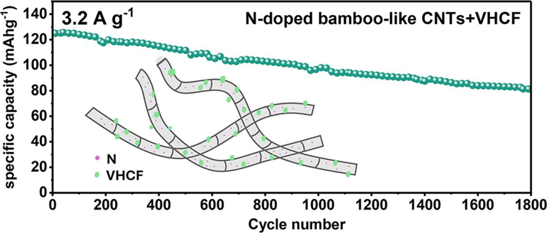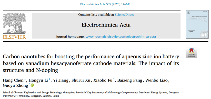 2023级能源动力硕士研究生李宏宇以共同第一作者在国际知名期刊《Electrochimica Acta》(中科院2区)上发表题为“Carbon nanotubes for boosting the performance of aqueous zinc-ion battery based on vanadium hexacyanoferrate cathode materials: The impact of its structure and N-doping ” 创新研究成果,陈航博士为共同第一作者,傅小波教授和钟国玉副教授为共同通讯作者,yl88858永利集团为第一完成单位。研究团队创新性地将铁氰化钒与不同结构的碳纳米管复合,探究了碳纳米管的氮掺杂特性与结构特征在提升铁氰化钒基水溶液锌离子电池性能中的关键作用。电池测试结果显示,引入碳纳米管可有效提升电极材料的比容量与循环稳定性。机理分析进一步表明,氮掺杂有助于增强充放电反应动力学过程,从而提高比容量;而竹节状与鱼骨状结构不仅能提供额外的机械支撑,也为Zn²⁺嵌入提供了更多活性位点,有利于提高电池比容量,同时延长循环使用寿命。该研究为开发柔性水系锌离子电池的碳基正极材料设计提供了重要的材料支持和理论依据。