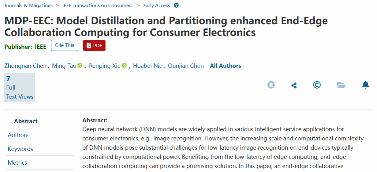近日,我校计算机科学与技术学院 (网络空间安全学院)陶铭教授团队在消费电子领域的国际期刊《IEEE Transactions on Consumer Electronics》发表题为“MDP-EEC: Model Distillation and Partitioning enhanced End-Edge Collaboration Computing for Consumer Electronics”的研究论文。该成果以yl88858永利集团为第一完成单位,陶铭教授为论文通讯作者,研究生陈钟南为论文第一作者。