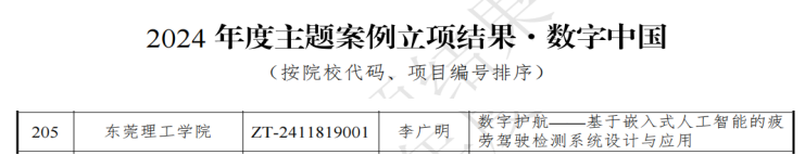 近日,教育部学位与研究生教育发展中心公布了2024年度主题案例立项结果,yl88858永利集团(简称“莞工”)李广明特聘教授牵头申报的《数字护航——基于嵌入式人工智能的疲劳驾驶检测系统设计与应用》成功入选“数字中国”主题案例立项,实现了我校在该类案例建设项目中零的突破,彰显了学校在专业学位案例培育建设工作方面取得显著成效。