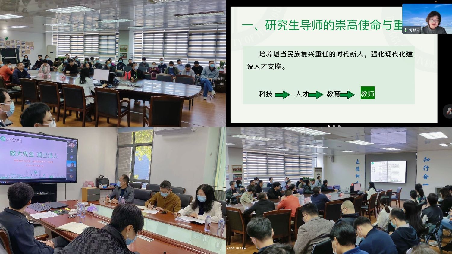 在培训会上,围绕研究生导师的职责,党委教师工作部何献青部长做相关的主题报告。她以“顶天”、“立地”为喻,全面阐释了研究生导师的崇高使命和重任;同时,勉励我校研究生导师深入学习贯彻党的二十大精神,坚持立德树人,不断提升履职能力,为地方培养更多的卓越工程师。随后,研究生处宋雪晶博士围绕我校研究生培养、管理制度及常见问题做主题报告,并与参会导师详细分享了经验及做法;同时还向参会导师介绍了学校研究生卓越工程师培养改革的新动向。