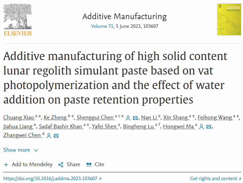 近日,我校3D打印与智能制造研究中心粤莞联合基金粤港澳研究团队项目“适应太空环境的月壤材料3D打印基础研究”课题组在增材制造领域的TOP期刊Additive Manufacturing(中科院JCR大类一区,IF=11.632)发表了最新的模拟月壤光固化3D打印成果《基于立体光聚合的高固含量模拟月壤膏料的增材制造及水溶液添加对膏料滞留性能的影响》(https://doi.org/10.1016/j.addma.2023.103607)